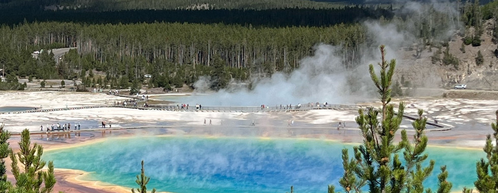 Where we spent most of our first day was in the Upper Geyser Basin. We saw so many different geysers and were supper lucky to have seen a couple of them. Of course we saw Old Faithful and so many of the impressive pools in the area. We saw Beehive Geyser that only goes off every 36 hours or more, Castle Geyser that is every 14 hours, Sawmill Geyser that is quite irregular with a few hours between shows, Grand Geyser that erupts every 7 hours and Fountain Geyser we walked right into which has about a 7 hour delay. It would be impossible to name all the colored pools and springs that we saw but our favorites on day 1 were: Abyss Pool, Morning Glory Pool, Black Pool, Bluebell Pool, Doublet Pool, Chromatic Pool. We finished off day 1 with an evening drive through the grasslands to see a massive herd of buffalo, including a few that came right up to the car.